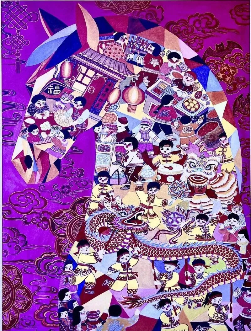 新年画之“新”,在于其重构了自身的存在方式,包括艺术指向与审美语法。首先是空间的解放——从静穆的门庭装饰步入流动的开放场域。如今,祈愿的符号挣脱门墙局限,化为可触摸、可流转、可交互的美学载体:或迁至城市广场,变身为引行人驻足的公共艺术装置;或跃上建筑幕墙,幻化为随光翩跹的绚丽纹样;或融入数字时空,在观众参与中延展为焕然常新的生动意象。年画寄托的美意不再囿于一图一画、一堂一室,而是拓展为可对话、可共创的公共文化体验。